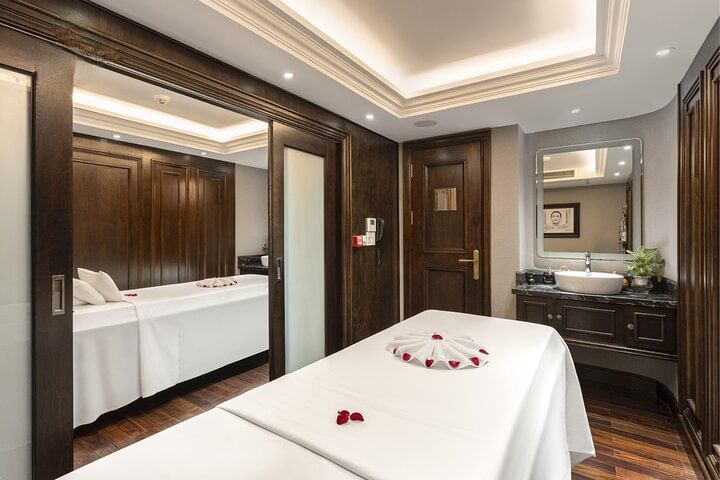All aboard the Ambassador, one of Halong Bay’s largest cruise ships, for an unforgettable 2-day, 1-night adventure. Enjoy hassle-free round-trip transfers from Hanoi or Halong Bay, deluxe sea-view cabins, and a full itinerary including tai chi, bamboo boat rafting, cooking classes, and delicious meals. Relax in the open-air Jacuzzi, explore stunning landscapes, and connect with fellow travelers on this exciting multi-activity cruise through Halong Bay Heritage.