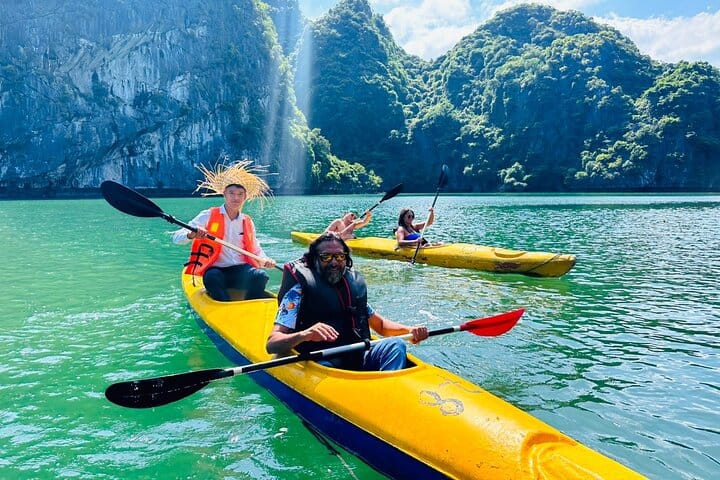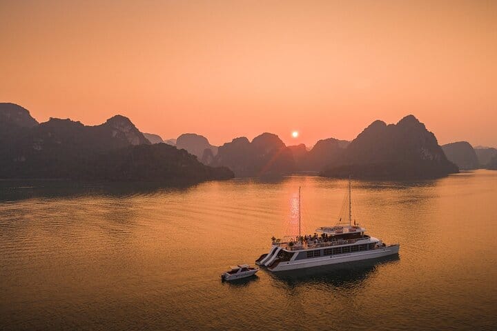 Tour Halong Bay in luxury and style with this premium cruise experience, designed for a seamless and relaxing day on the water. Your itinerary is fully organized by a professional guide, allowing you to simply enjoy the journey—whether you prefer swimming, kayaking, or lounging on the sundeck. The experience includes welcome drinks, a freshly prepared lunch, a cooking class, and a sunset party on board. Round-trip transportation from Hanoi Old Quarter is provided for maximum convenience, and all meals, snacks, and refreshments are taken care of. With approximately seven hours spent cruising the bay, longer than most day tours, this all-inclusive experience lets you unwind and enjoy Halong Bay without worrying about any planning.
