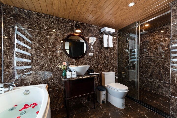 Enjoy a memorable 2-day 1-night overnight cruise on Ha Long Bay aboard the luxurious 5-star Amanda Cruise, featuring comfortable ensuite cabins and all meals included. Depart conveniently from either Hanoi or Tuan Chau Port and be captivated by the stunning views of the UNESCO World Heritage-listed bay. Experience exciting activities such as kayaking, swimming, and exploring Sung Sot Cave with its magnificent stalactites. Alternatively, unwind on the sundeck with a refreshing drink or join a Tai Chi session while soaking in the breathtaking scenery. All activities, accommodation, meals, and entry fees are included, giving you the freedom to choose your preferred way to explore this natural wonder. Dine under the open sky on the ship’s sundeck when weather permits for an unforgettable experience.
